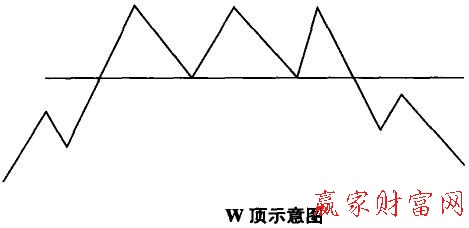 另外,“W”形出现在顶部与双重顶即“M”形出现的原因是一样的,只不过是主力多做了一次反复上涨的动作,为出货多留出了一些时间和空间,比照涨幅来说,主力只有在获利不多或力求自保的情况下才会这样做(无法大幅拉升股价的原因有很多,比如市场不认可、主力资金不足想要退出、公司即将发布利空消息等等),所以,“M”顶多出现在涨幅巨大的个股身上;而“W”顶多出现在涨幅相对巨大的个股身上;而“W”顶多出现在涨幅相对较小的个股身上,通过这种股价反复上扬为求在高位多出掉些筹码。如下图所示为W顶形态示意图。W顶形成的过程是这样的:当一只个股上升较大幅度之后,股价产生回落再也无力创出新高,当连续有两次冲高时都被前高受限,由此形成W顶。本形态说明在第一次创出新高后,在后两次冲击前高时并没有顺利通过,说明前期顶点抛压极大,市场已经无继续做多能力,头部基本宣告成立。因而当W顶完成后,股价往往会产生回落,很多时候就会从此走向下跌之途,下跌的最小幅度理论上为顶部至颈线位(即形成W顶形态时两个底点的连线)的距离。投资者在运用此理论时需要注意的有:①W顶的完全形成要等待两个谷底的支撑线(颈线位)被突破才算完成。否则就可能形成箱体整理的形态。②每个峰顶都伴随有较大的成交量并且逐渐减小,在突破颈线位时带有明显的成交量则可信度会更高。