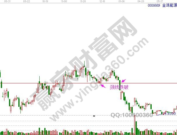 从形态上讲,跌破颈线是必须卖出的位置,但是当到达第二次的高点位置回调的时候,就已经到达了大家设置的止损位置,或者是到达压力的时候就已经是触发了卖点。跌破颈线是给出的出局位置,代表二重顶正式形成,后市往往会有不短时间的下跌。但是在实际操作中,小编还是认可未雨绸缪。大家可以参考下方金鸿能源(000669)的走势。