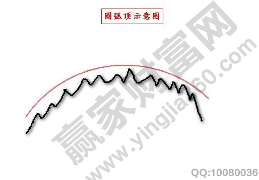 当股价走到市场的顶部的时候,多方的攻击越来越小,空方的力量逐渐增强。这也就造成了在市场的顶部会盘整一段时间,虽然K线的实体非常小,但是整体是向下,股价会越来越低,这就是圆弧顶的走势,如下图的示意图。
