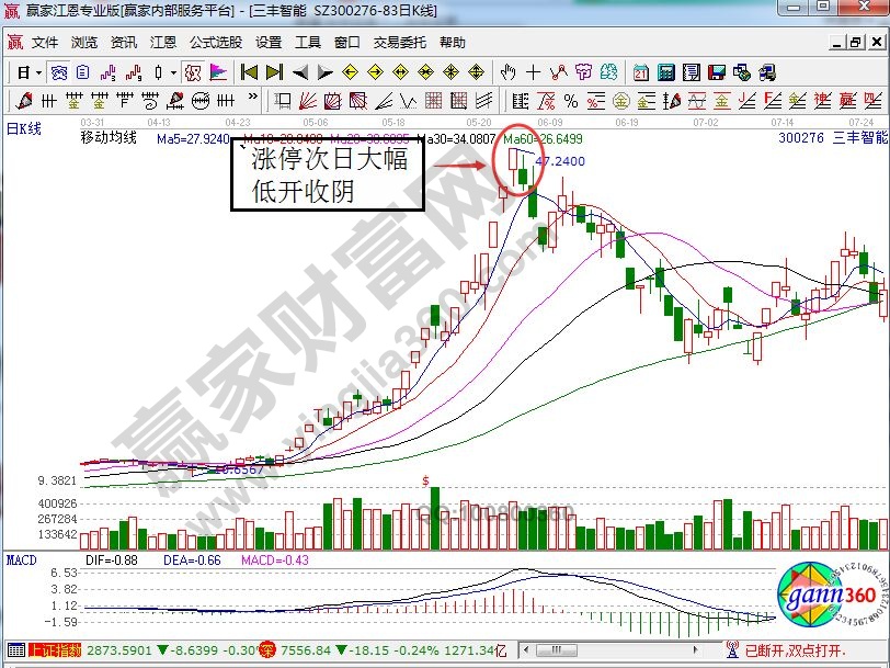 在2015年的牛市中,三丰智能出现了一波飙升的行情,而且该股在主升浪的后期连续拉出涨停,累计涨幅超过3倍,如上图所示。股价在大幅的上涨之后的高位,在2015年6月3日,当天拉出一个涨停板,上涨的势头是非常猛烈的,可是在第二天股价却大幅低开4.97%,股价略微冲高之后逐波的走低,急转直下奔向跌停,在盘中一度封在了跌停板的位置,尾市打开跌停板,当天下跌8.57%,这样就形成了典型的一个头部形态了。