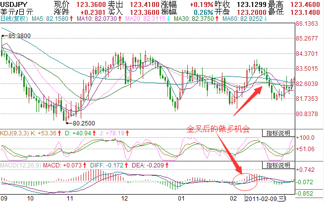 1、趋势的变化就是外汇的基本走势,不仅仅是在基本面的变化,更是技术上的分析判断,其趋势判断主要是依据股票分析中的技术指标线来完成的,采用的是macd指标详解其走势的变化。如图usd/jpy在2011年1月11日的5分钟K线走势图,出现了向下的趋势,(由赢家财富网编辑,转载请注明出处,www.yingjia360.com)通过观察其macd的趋势反映,macd出现了死叉,柱轴线在0轴一下持续的放大,所以在这个位置建立买单是正确的。