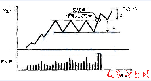 如果对于三角形突破已经比较了解,那么对于矩形也是很容易理解的。矩形的分析市场意义跟三角形相同,不同在于每次回踩的时候地点在一条水平线上,而不是逐渐上移。矩形整理也称之为箱体整理,就像将股票放在一个箱子里面,上有盖下有底,股价在这两者之间来回运动。着这个过程中,上涨时