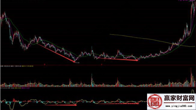如果是上市了有段时间的非新股,就可以通过macd底背离筛选出主力是否在收集筹码。macd是众多指标中绝对不能被造假的一个指标。因为主力的资金过于庞大,不是一两天就可以进入一个股票的,所以当主力逐步的吸货的时候,macd就会出现异常,也就是底背离(如下图所示)。