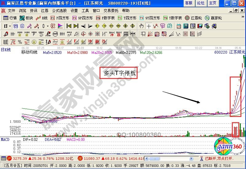 该股在这之前的最低价:2005年7月21日 1.58元,最高价为2006年2月14日 2.54元。启动价为2006年5月8日2.40元高开3分,以2.61元涨停板收盘,一举突破2006年2月14日的高点2.54元,后一路狂涨至最高7.20元!当然这其中就出现了T字涨停板。