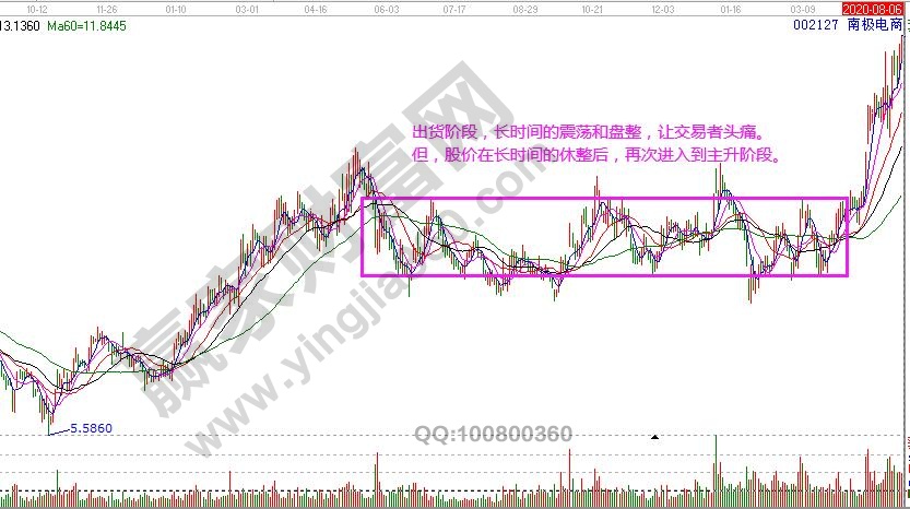 出货阶段的初期,股价波动剧烈震荡,这是多空双方为获得趋势掌控权的较量,当这个过程表现在股价图上时,就意味着买方市场逐步衰弱,市场进入到更为中性的环境。由于如今的震荡来自一只前期处于牛市上涨中的趋势性行情中,趋势交易者需要大幅降低对后市持续上涨的预期,并开始寻找其他的交易机会。但是要注意一点,出货并不意味着股价将反转进入下跌阶段,但这种犹豫不决的走势短期内不会给投资者带来太好的机会,股价有可能重新获得上涨趋势,但是这需要时间来修复。价格的滞涨和长时间的震荡令持股者沮丧,因而持币会是一个更好的选择。因为有钱,就可以选择或者等待更好的机会。