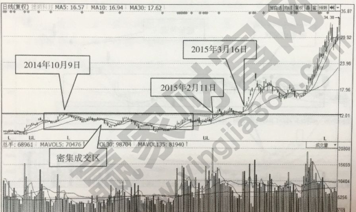 第二,股价回落至密集成交区时,会形成一定的底部形态,表明股价将再度上涨。