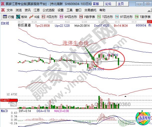 例如,600604市北高新2016年12月22号涨停,收盘价在极反通道生命线上,依据历史统计数据得出,弱势行情下使用此方法可保障本金的安全,该股次日高开最次下探至生命线位置,规则约定为此线为介入点,随后十几个交易日里行情向外轨线发展,短线有获利点,最差能做到无利出局。