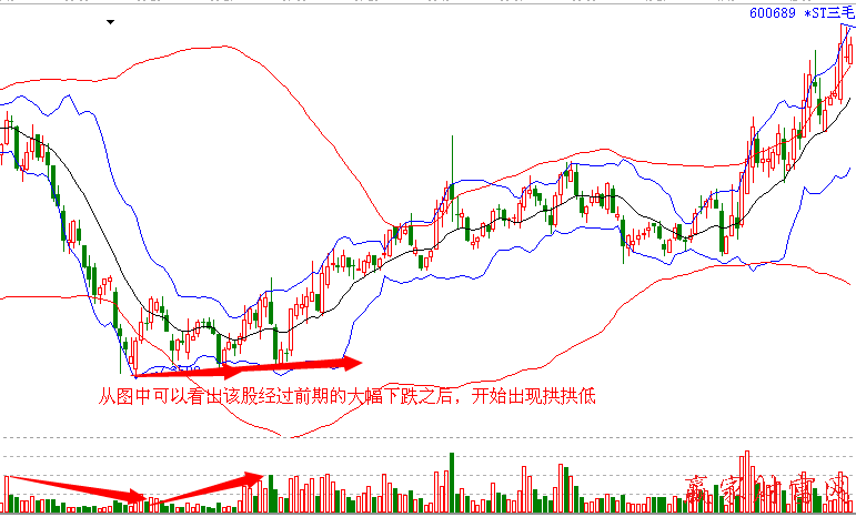 从成交量来分析这个股可以看出,该股该股经过快速杀跌之后,开始缩量整理,而且在底部有反弹的迹象出现,在结合图中的布林线可以看出,该在底部附近三次触及布林线的低轨,然后开始大幅反弹。