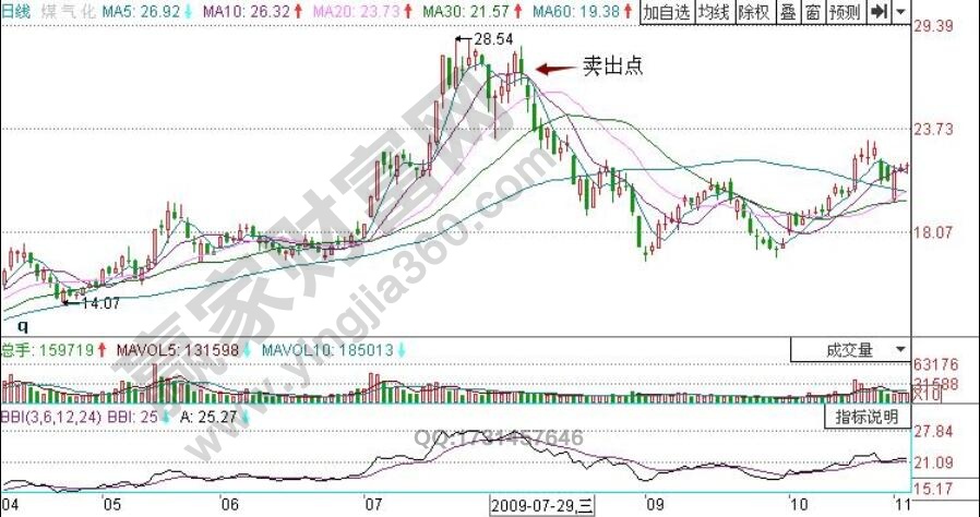 如图所示为煤气化(000968)的走势图,从图中可以看到,在2009年7月29日K线第一次从上向下跌破BBI曲线后,第三天的股价又重新站到了BBI曲线上,不是有效跌破。而当8月6日K线再次向下跌破BBI曲线后,股价没有重返BBI曲线的上方,此次为有效跌破,投资者就应该考虑及时卖出股票。