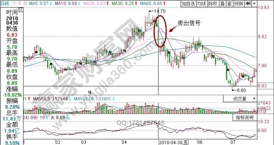 股价经过前期长时间的上涨后,周K线在高位出现滞涨迹象,BBI曲线的运行方向也由前期上行转变为横向运行,那一旦周K线向下突破BBI曲线,说明中线下跌行情即将展开,为卖出信号。