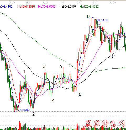 如上图,结合上文所述,从波浪结构中我们可以发现,中长线投资者的交易次数非常少,中线投资者次之,短线交易的机会则很多。从市场的波动幅度看,主要趋势的波动幅度大,如图中的2——5、5——C;次级趋势的波动幅度相对较小,如2——3、B——C;小趋势的波幅就远远小于主要趋势的波幅。
