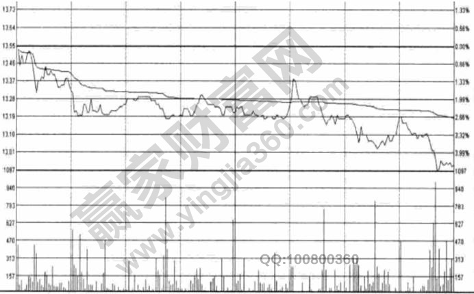 从这个图形走势中,我们可以看到卖方抛压是非常明显的。分时图显示开盘30分钟内股价出现两波快速跳水,并且在跳水过程中都有量能的放大,空单明显占优,显示盘中卖方占据主导低位。虽然之后出现四组半小时的横向整理动作,但通过下面的量能变化可以清楚地看到依然有不少大卖单放出,由此可以感觉到股价正在遭受极大的抛压。