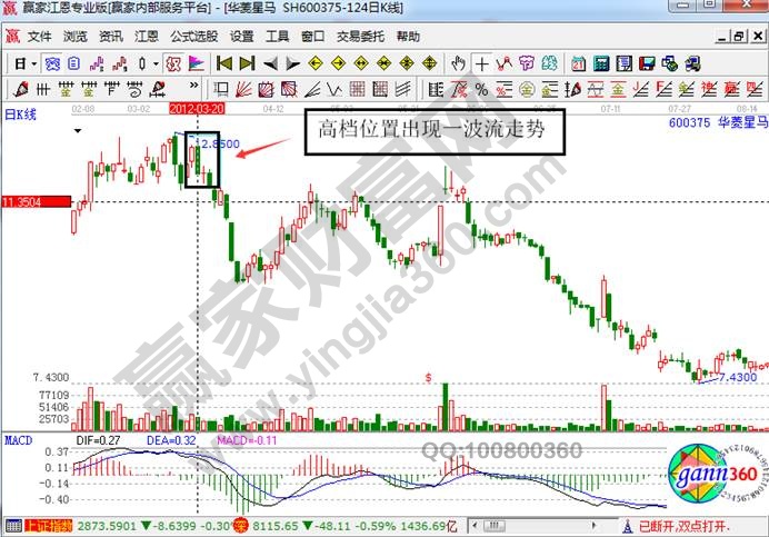 关于高位出货一波流的分时走势特征就介绍到这里,下面我们就来看华菱星马的实战案例走势分析。下图是该股在2012年3月份的日K线走势图。