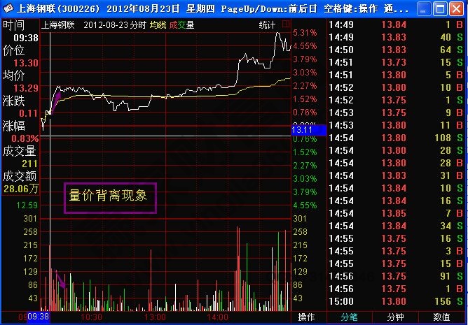 上图是上海钢联(300226)的分时走势图,从图中我们可以看到,早盘第一时间段股价平开后略微的向下,之后将会被迅速的拉起,然后缓慢的被推高,并且在第一时间段下半段出现了量价背离的走势,然后股价走势平缓下滑,同时成交量也随之放大,那么这种走势意味着什么呢?它就意味着主力诱使短线客出局,建仓后期拉升的抛压。